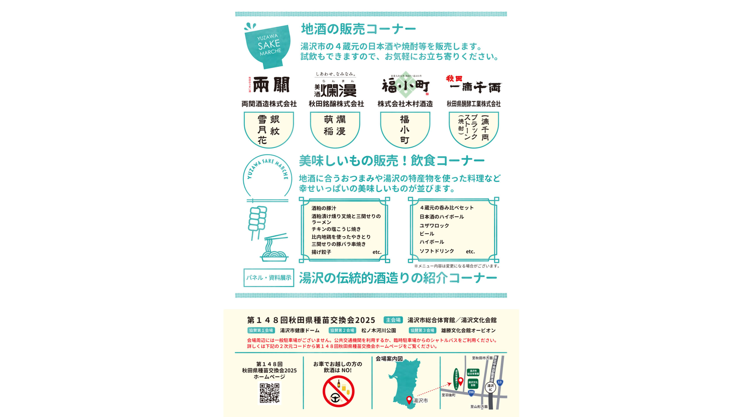 湯沢市の4酒蔵の地酒の販売コーナーやゆざわの美味しいおつまみ、料理を提供するコーナー、ゆざわの酒文化を紹介するコーナーを設置予定。ぜひ秋の風に吹かれながら美味しいお酒と料理をお召し上がりください。