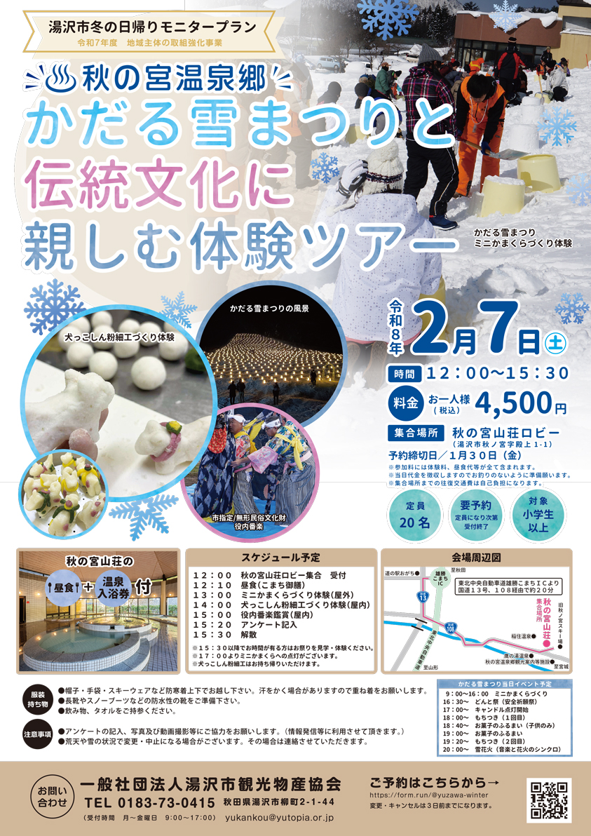 秋の宮温泉郷かだる雪まつりと伝統文化に親しむ体験ツアー